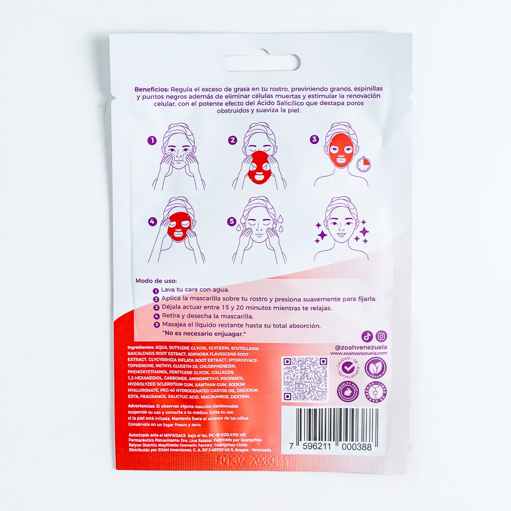 Mascarilla facial formulada para el tratamiento de la piel grasa y propensa al acné. Utiliza Ácido Salicílico para una potente acción purificante que destapa los poros. Además de prevenir imperfecciones, nutre y promueve la renovación celular, dejando la piel más suave y clara. Se presenta como una mascarilla de velo de un solo uso que no requiere enjuague.